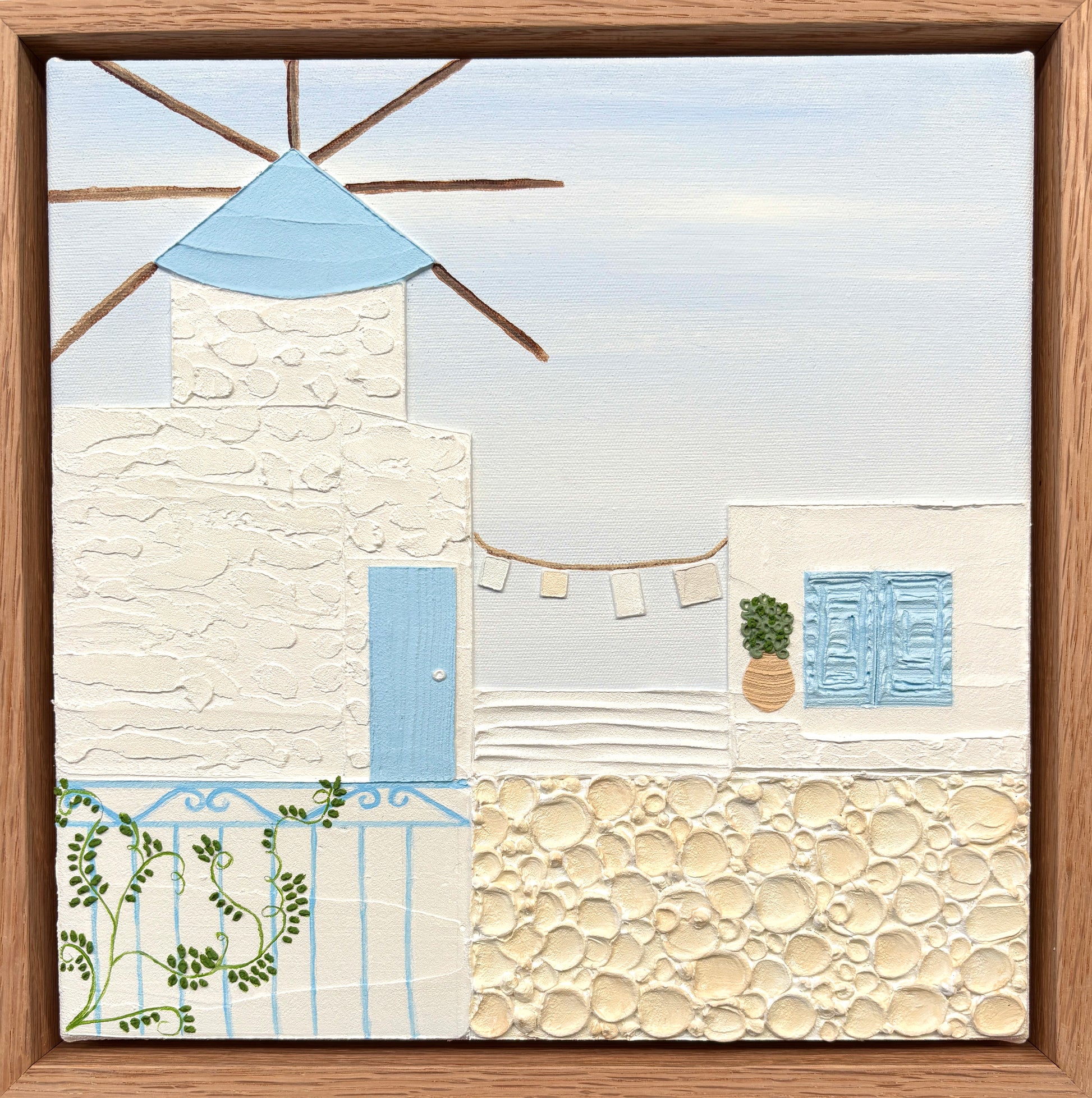 Framed in natural oak, this textured artwork is inspired by the quiet beauty of the Greek isles — where earth tones meet the soft blue of the Aegean. Layers of paint and texture evoke sandstone cliffs, sunlit waters, and the stillness of island horizons. A piece that captures both serenity and wanderlust, inviting the calm rhythm of the Mediterranean into your home. Pame?